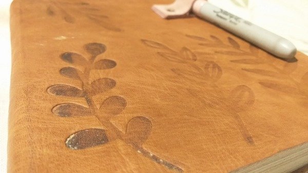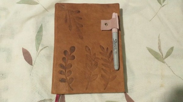 - Portalapicera: Incorpora un soporte lateral confeccionado en cuero descarne teñido de color rosado, fijado con un remache metálico para asegurar la herramienta de escritura.
