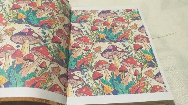 Guardas: Intervención interna con diseño botánico de hongos en una paleta multicolor, generando un contraste visual al abrir la pieza.