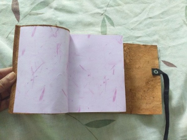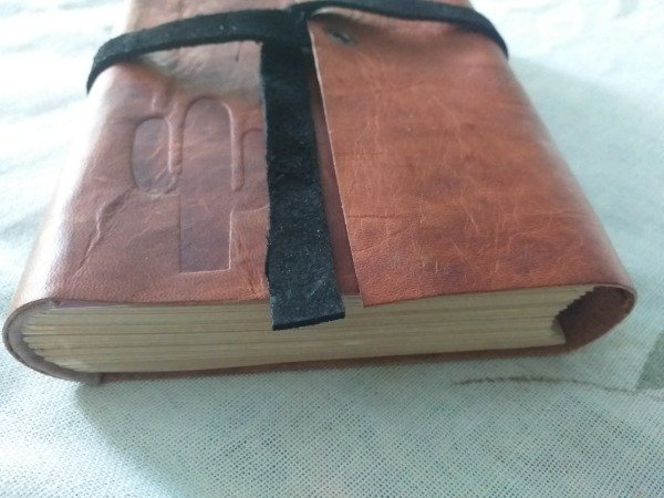 Para su cierre, cuenta con un tiento de cuero vacuno (descarne teñido) que abraza la pieza, permitiendo un ajuste seguro y rústico. El interior contiene 200 hojas de papel ecológico, protegidas por la flexibilidad y resistencia natural del cuero.