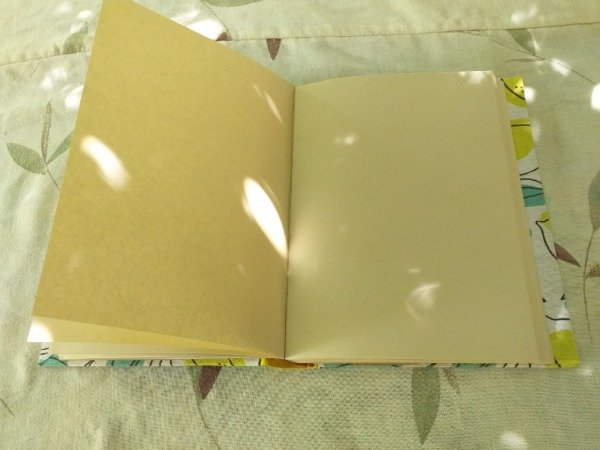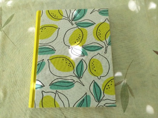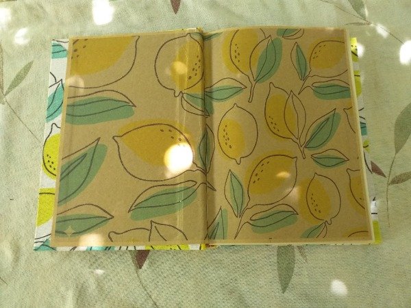 Este cuaderno de tamaño A5 destaca por su encuadernación artesanal en estilo Bradel con lomo curvo, una técnica que garantiza durabilidad y una apertura cómoda. El diseño combina una tapa de tela estampada con motivos botánicos y un lomo reforzado en tela de encuadernación color amarillo, logrando un contraste vibrante y resistente al uso diario.