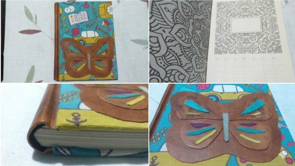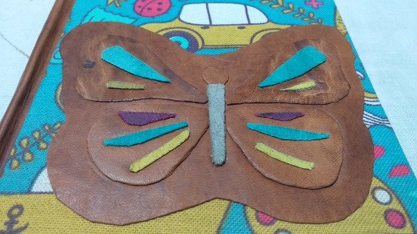 Tapa: Composición mixta sobre base estampada que incorpora una mariposa trabajada mediante la técnica de mosaico de cueros, logrando una pieza de relieve y textura única.