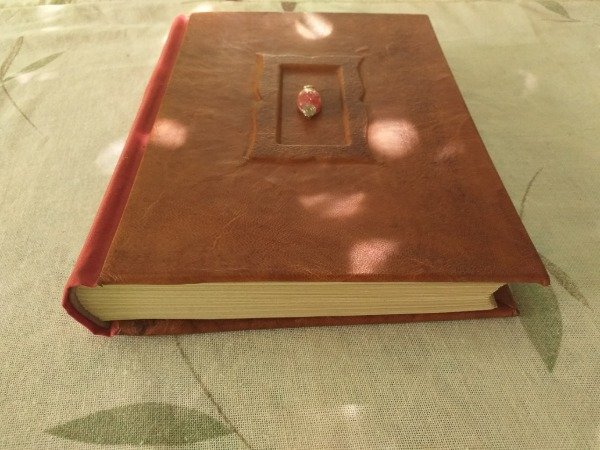 Esta bitácora de alta gama presenta una encuadernación estilo Bradel con lomo curvo en color rojo, que aporta una estructura robusta y una apertura superior. Está confeccionada en cuero de chivo de Choya (curtido vegetal) e incluye un trabajo de sobrerrelieve en la tapa que añade textura y volumen al diseño.