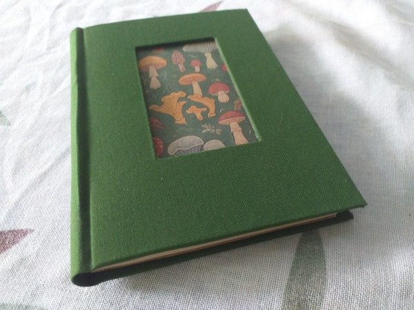 Este cuaderno tamaño A6 mantiene la estructura de encuadernación artesanal con lomo curvo y tapa entelada en color verde bosque. Su rasgo distintivo es la ventana calada en la tapa frontal, que funciona como marco para exhibir una guarda con diseño exclusivo de Selva Editorial, protagonizada por una ilustración detallada de diversos tipos de hongos.