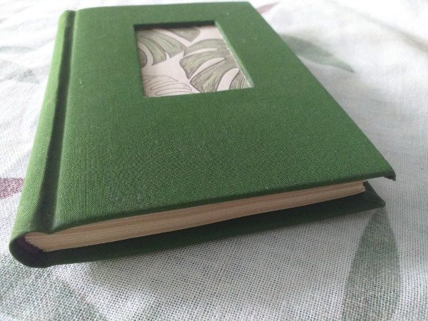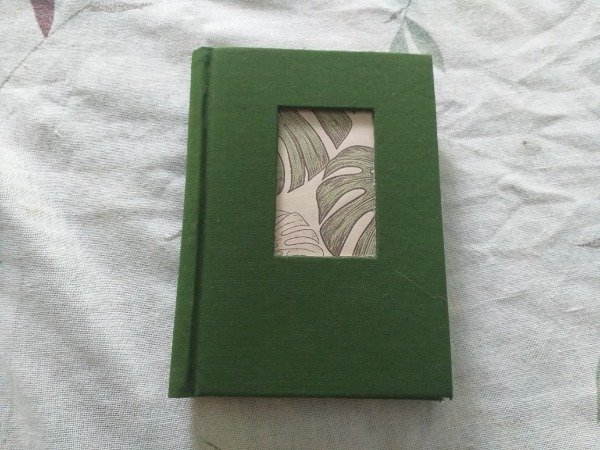 Este cuaderno tamaño A6 es una pieza compacta y funcional, ideal para llevar siempre encima. Presenta una encuadernación artesanal con lomo curvo y una tapa entelada en color verde bosque que incluye una ventana calada en el centro.